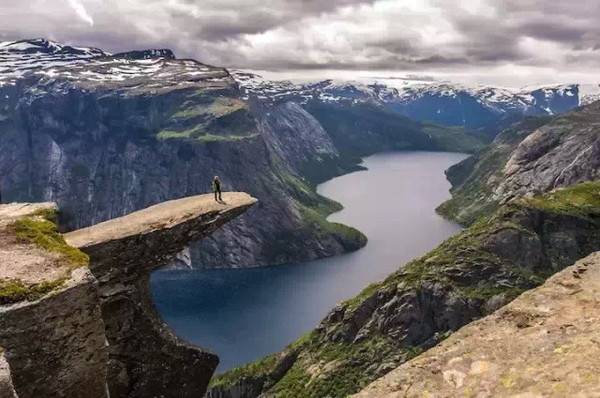 真正的舌尖诱惑,难以抵达却又绝对震撼。恶魔之舌是一块凌空横在海平面上1000多米的巨大岩石,被称为哈当厄尔的布道石,气势磅礴。众所周知挪威以山妖(Troll)为象征,而这块 山中峭壁上突兀出的扁平细长岩石,正如山妖的舌头一般伸出悬在湖面之上的高空中,让人看到就胆战心惊,因此得名。这条徒步难度系数较高,不适合老人儿童。