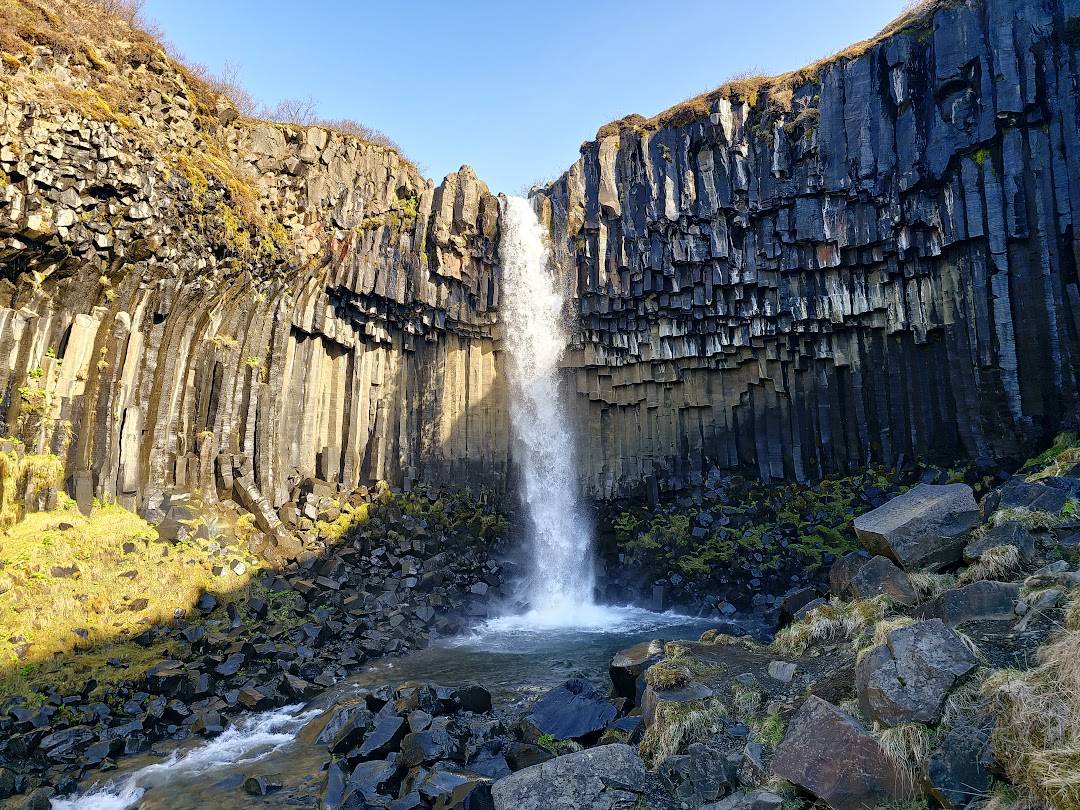 斯瓦提瀑布,也被称为‘黑瀑布’,是一座周围环绕着暗色玄武岩柱的壮丽瀑布,位于瓦特纳冰川国家公园的斯卡夫塔山地区。