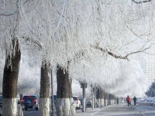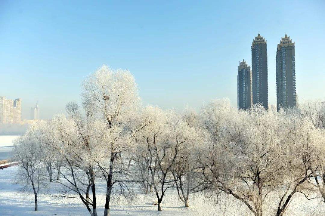在城市里,松花江蜿蜒流过,由于风向和江岸走向的不同,形成雾凇的时间和地点也会有所不同,早晨沿江而行,伴着江雾,人在城内,感觉身处仙境。