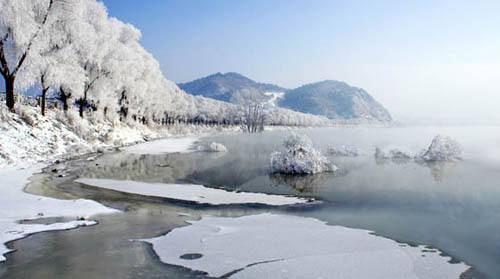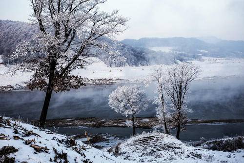 冬季湖水暖气上升,晶莹的树挂绮丽多姿,与湖畔群山相环抱形成静谧圣洁的雾凇景观。