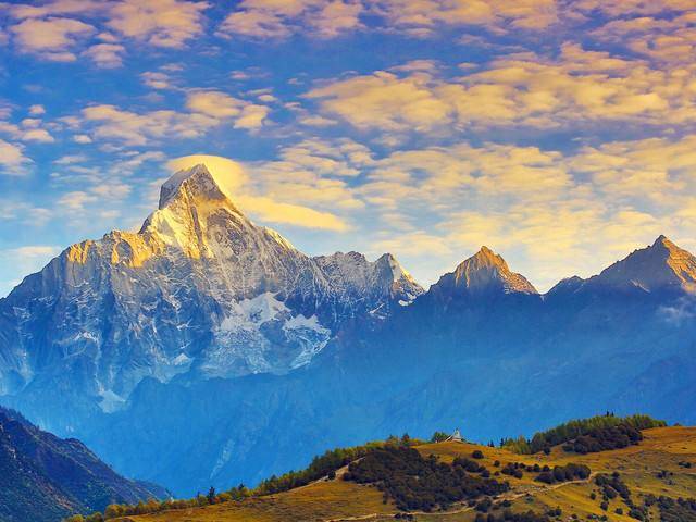 四姑娘山位于四川省阿坝州小金县四姑娘山镇境内,属青藏高原邛崃山脉,由四座绵延不断的山峰组成,从幺姑娘山(幺妹峰)、三姑娘山、二姑娘山到大姑娘山,其中幺姑娘山海拔6250米,为四川省第二高峰。