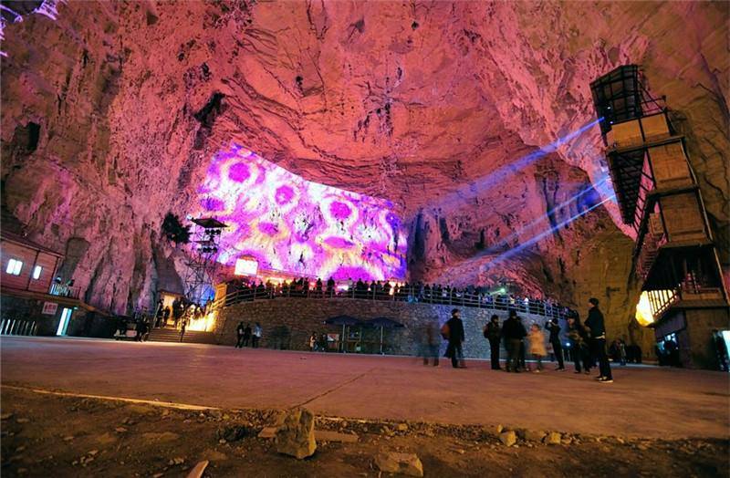 腾龙洞隶属于国家地质公园,集山、水、洞、林于一体,位于利川市。曾被中国国家地理杂志评为“中国最美的地方”。中国最大的溶洞,里面广阔无比,站在里面根本体会不到洞穴给人的紧闭感,直升机都能进去。腾龙洞不仅仅有激光表演,还有大型情景歌舞表演,在暗淡的洞穴内观看一场实景光效的表演,这可是不可多得的体验。