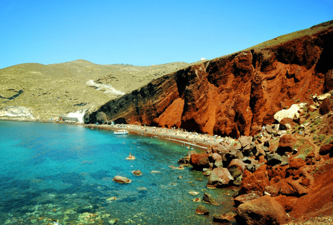 圣托里尼南端的Acrotiri(阿克罗提尼)有一片世外桃源般的美丽海滩,那就是红沙滩。这片海滩是由大片大片的红色裸岩组成,这些岩石因富含铁物质,呈现出美丽的红色,在阳光的照耀下更加神奇和耀眼。当缓缓行走在沙滩上,尽情沉浸在红色石头与碧蓝海水相映成趣的景观中。越过红色岩石,可以看到金色的阳光洒在海面上,波光粼粼,美不胜收。这里没有高楼大厦,没有人群喧嚣,只有大自然的神奇美景,是让人沉醉的一片天地。