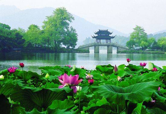 西湖十景之一,其所在的風荷公園內栽培了上百個品種的荷花,夏季顯出分外迷人的吸引力。南宋時,此地有一釀酒作坊,取溪水造麴酒,每當夏日風起,酒香荷香沁人心脾,故稱“麴院風荷”。蓮葉田田,菡萏妖嬈,水面上架設了造型各異的小橋,人從橋上過,如在荷中行。