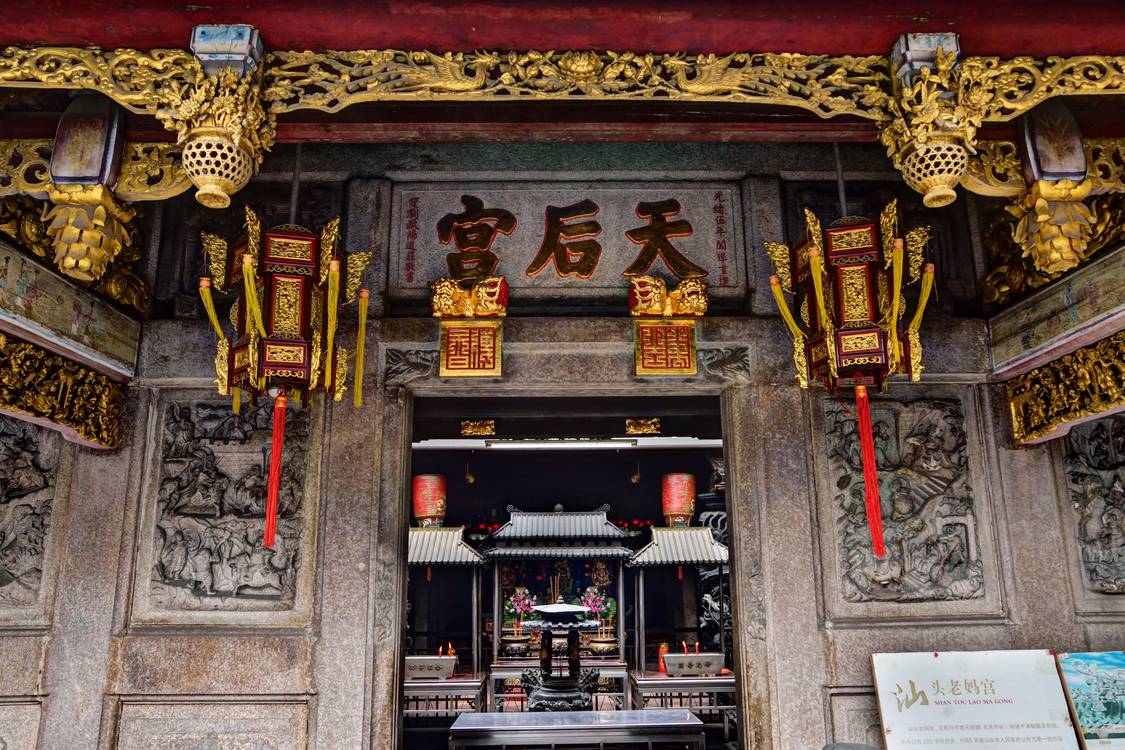 老媽宮位於外馬路頭,又稱天后宮,它與隔壁的關帝廟都是汕頭開埠前早期的建築。老媽宮建於清朝嘉慶年間,1992年重修開放。當初這裏是濱海的沙灘,當地船舶出海和潮人出洋都要在這裏祭祀拜別,包一點香灰隨身攜帶,以示對故鄉的懷念之情;海外潮人回鄉時也總要來此參拜,以寄託對先祖的緬懷。
