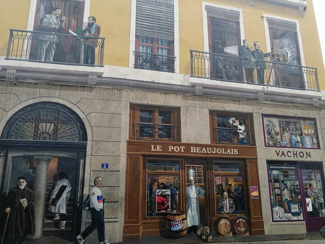 位於里昂索恩河和羅納河之間的半島西邊,靠近聖文森特橋的Fresque des Lyonnais是里昂城中最著名的壁畫之一。這幅巨大的壁畫由七層樓高,在里昂的壁畫中尤其獨特。壁畫描繪了里昂的名人,例如小木偶吉尼奧爾,織布機發明者Joseph-Marie Jacquard和金髮小王子。最吸引人之處在於壁畫的最底層描繪了六位普通市民的形象,展現了里昂人民的生活點滴。可以站在對面,細細欣賞這件藝術品,想象自己躋身壁畫之中,成為故事的主人公。