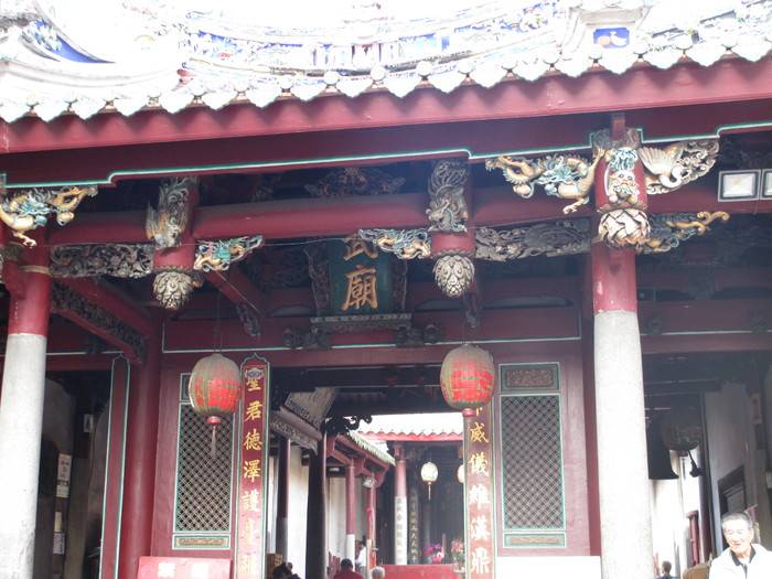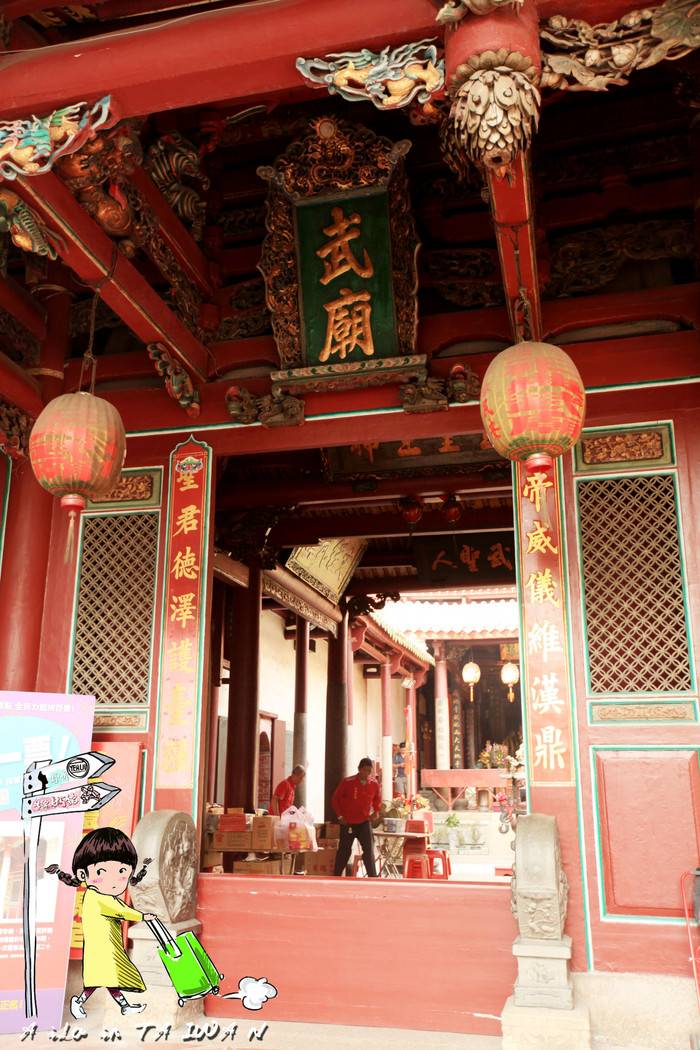 在台南市赤崁樓南邊的民族路上,穿過永福路,就能看到一間武廟,這就是祀典武廟,它是祭祀關公的廟之一,台南市有兩間武廟,另一間是開基武廟。這兩座武廟的距離約為一百米,被當地人稱為大關帝廟和小關帝廟,其中祀典武廟是台南最古老的武廟,始建於明鄭時期,最初是祭祀岳飛和關公的,但清朝攻台後逐漸變成主祀關公,後來被追封為關帝三代,並且重建了正殿和廟門,成為了官方主祀典廟宇,因此被稱為祀典武廟。此外,在祀典武廟裏還有一個月下老人,是台灣三大姻緣靈廟之一。
