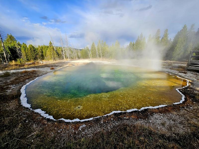 300-ft.-wide hot spring with a boardwalk offering views of its famously rainbow-colored edges.