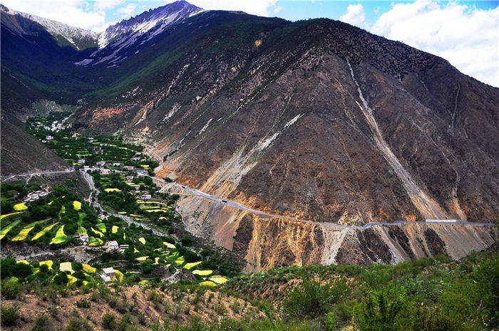 覺巴山(又稱腳巴山)——在四川西部的巴塘到西藏東部的芒康縣和左貢,地處橫斷山脈的三江(金沙江、瀾滄江、怒江)流域,包圍在安久拉山、伯舒拉嶺、拉烏山等群山中。川藏公路30公里的覺巴山盤山路,在西藏芒康縣的竹卡村-登巴村,近2000米的相對高差,成了川藏線上最難爬、最費時的一座山。山不高,起伏高:埡口的標高3940米,瀾滄江深深下切,江岸壁立千仞。上山的入口處立了許多警示牌提醒注意一路飛石、塌方、泥石流。一山藏四季,頃刻有風雨。