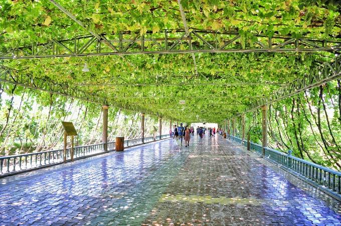 在火焰山下的峽谷中,葡萄溝因高山上融化的雪水,種植著美味的吐魯番葡萄,這裡的葡萄品種特別多,品種也特別甜,如果湊合到季節,可以在葡萄架下面支起桌子,一邊品嚐維族的美食,一邊摘葡萄架上的葡萄。