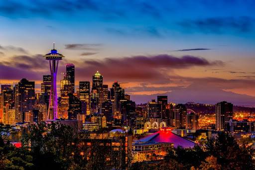 凱瑞公園是拍攝西雅圖夜景的最佳地點,從該角度拍照不僅可以將西雅圖市區和太空針收在你的鏡頭裡,還能在天氣晴朗的時候拍到瑞尼爾雪山的山頂。如果足夠有耐心,可以於黃昏時在山上看著天色慢慢變暗,從橙色變成淺藍,再變成深藍,最後變成紫色。一個人站在高處看著城市慢慢染上燈火的光輝,就會在心裡想,世界上怎麼會有這麼一個城市,可以滿足人們對美好生活所持有的全部臆想,讓人無限期望擁有這千百盞燈的其中一盞。西雅圖諸多城市及太空針塔、雷尼爾山的風景明信片都是在此地拍攝的。