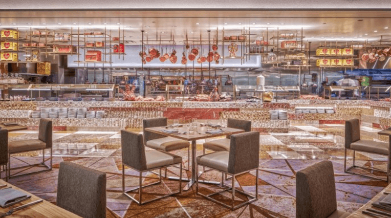 Luxe, modern Caesars Palace buffet offering nine show kitchens, diverse cuisines, and pool complex views.