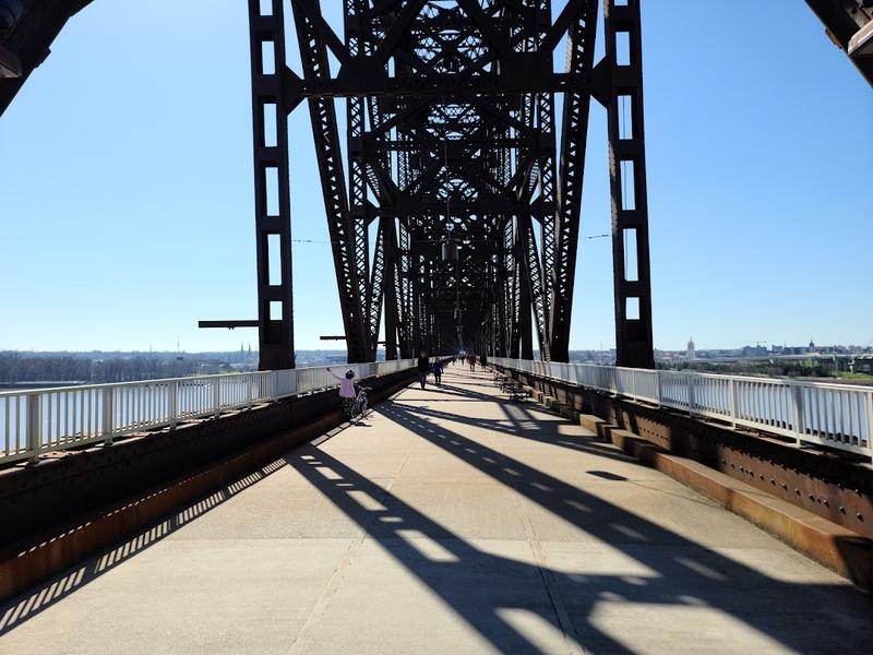 Converted railroad bridge with seasonal lighting offering walkers scenic treks over the Ohio River.