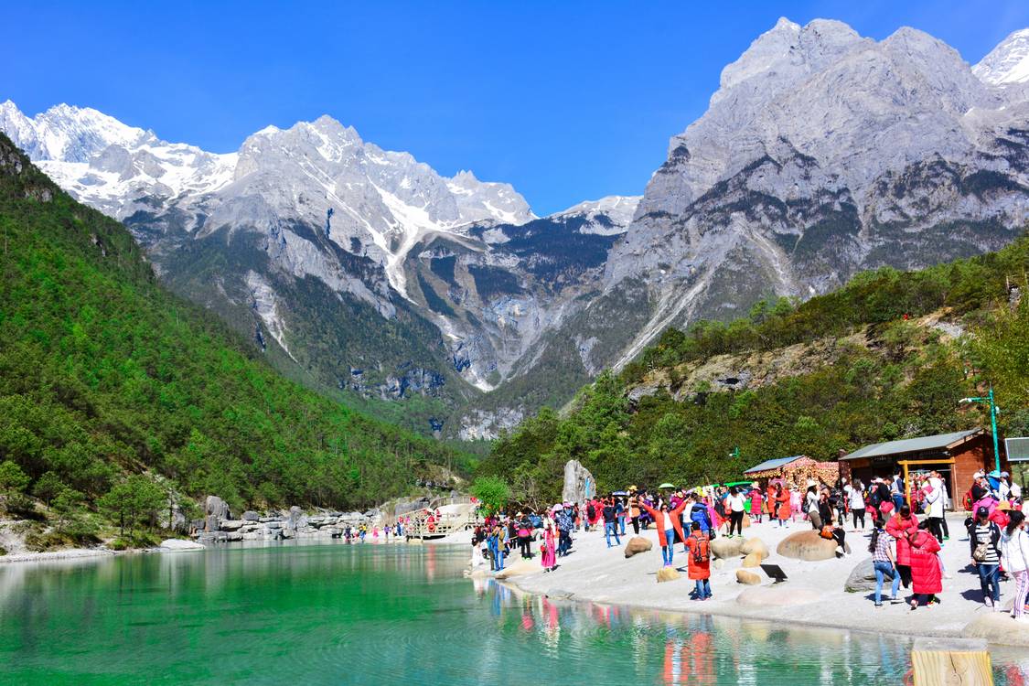 玉龙雪山是丽江著名的自然景观,游客可以乘坐冰川大索道攀登峰顶,欣赏雪山的壮丽景色,还可以游览蓝月谷,感受湖水的湛蓝与雪山倒影。
