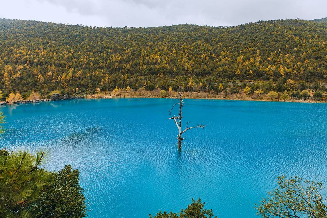 蓝月谷位于玉龙雪山脚下,以湖水的湛蓝和周围雪山的倒影闻名,是一个宁静而美丽的自然景点。