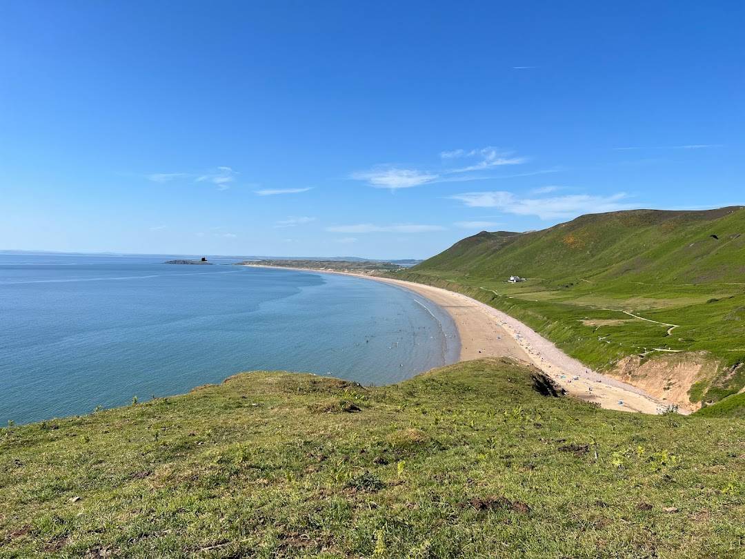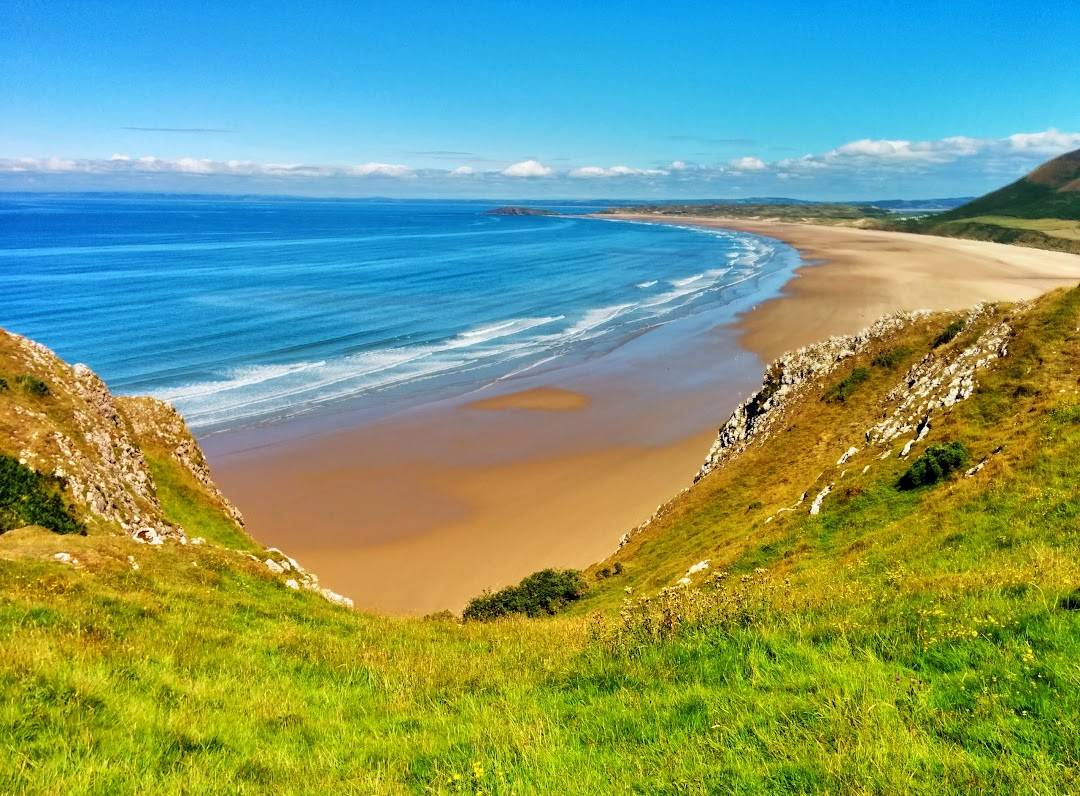 罗西利湾是高尔半岛最著名的海滩之一,以长达三公里的弧形沙滩和风大浪高的海面闻名,多次被评为英国和欧洲顶级海滩。这里是冲浪、漫步和观赏日落的绝佳地点。
