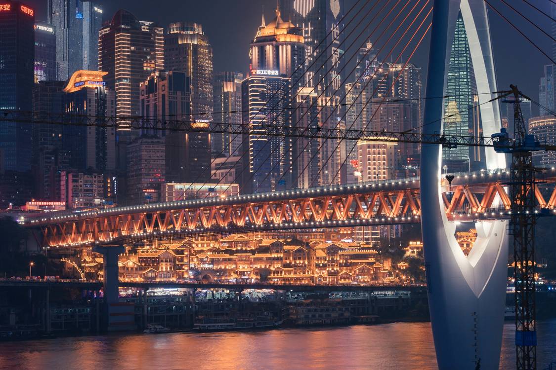 这是一座以红色结构给人深刻印象的大型桥梁,是同时拍摄洪崖洞与江边夜景的绝佳取景地。桥上设有步行通道,可以徒步走过大桥,一边欣赏两侧城市天际线与江景,常被纳入夜景散步路线的核心路段。