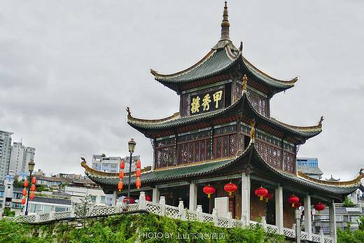 贵阳市地标建筑,位于南明河之上,以河中一巨石为基座,建筑上的朱梁碧瓦,四周水光粼粼,名副其实,堪称甲秀。