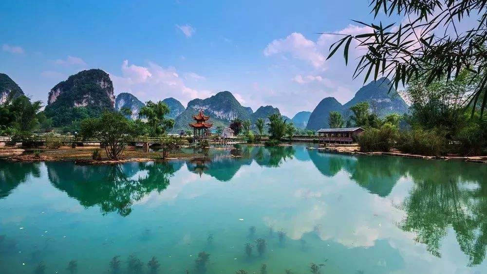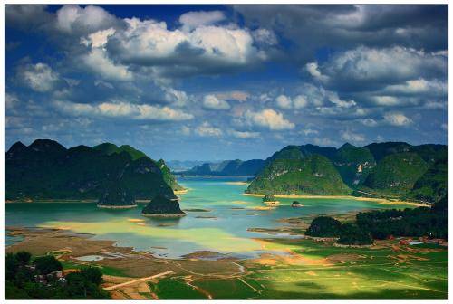 渠洋湖是一个大型的喀斯特高原湖泊水库。湖长为15公里,最宽处有1公里,是百色市的第二大人工湖。水质优良,有大小岛屿十多个,沿岸有海拔一千多米的岜行山,以及掩映在绿树翠竹当中的几百个壮族干栏式村寨。