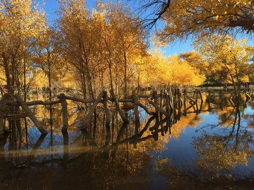在这荒凉的沙漠,只有胡杨林在沙漠上,显得尤为美丽动人。它是唯一一种能在沙漠和沙地上生长的树类,它非常的耐热和耐寒,它可以扎根于地下13米,在极度干旱的地方也能吸收水分。沙漠里的绿洲尤为珍贵,所以,能见到这种很自然罕见的树也是算是不虚此行了。