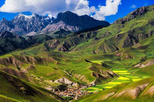 祁连山草原,位于青海甘肃交界处的祁连山山脉,属于高海拔草原,祁连山草原十分的辽阔。草原,白云,牛羊群,雪山,牧民和冒着炊烟的帐篷构成了它绝美的画卷。微风吹来,会使人产生返璞归真、如入梦境的感觉。蜚声中外的远东第一大牧场──山丹军马场也建在这里。