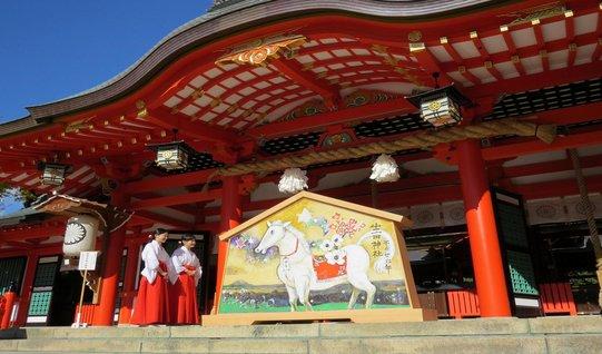 伏见稻荷大社坐落于京都南部稻荷山山麓,历史悠久。传说在这里供奉的农业之神稻荷可以保佑商业繁荣、五谷丰收,因此吸引了众多香客前来参拜。狐狸被视为神明的使者,因此这里有许多不同造型的狐狸石像以及狐狸脸形状的祈愿牌,展示了人们对狐狸的崇敬之情。伏见稻荷大社不仅主建筑物值得一看,而且以其后的“千本鸟居”著称。这条通向山顶的路上有数百座朱红色鸟居,全程约4公里,步行到山顶来回需要2-3个小时。这段路程是京都代表性的风景之一,也曾在电影《艺伎回忆录》中出现过,以千本鸟居作为背景的场景令人印象深刻。