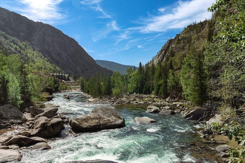 布尔津河的主要支流——喀纳斯河,起源于喀纳斯湖,湖水倾泻而下,在山谷中蜿蜒形成了多处风景如画的水湾河滩,如卧龙湾、月亮湾等。从喀纳斯湖南端的出水口到鸭泽湖,河段密布着巨石,水流湍急奔腾;而从鸭泽湖到卧龙湾河段,河面开阔,水流平缓,河滩上绿草如茵,两岸树木繁茂。