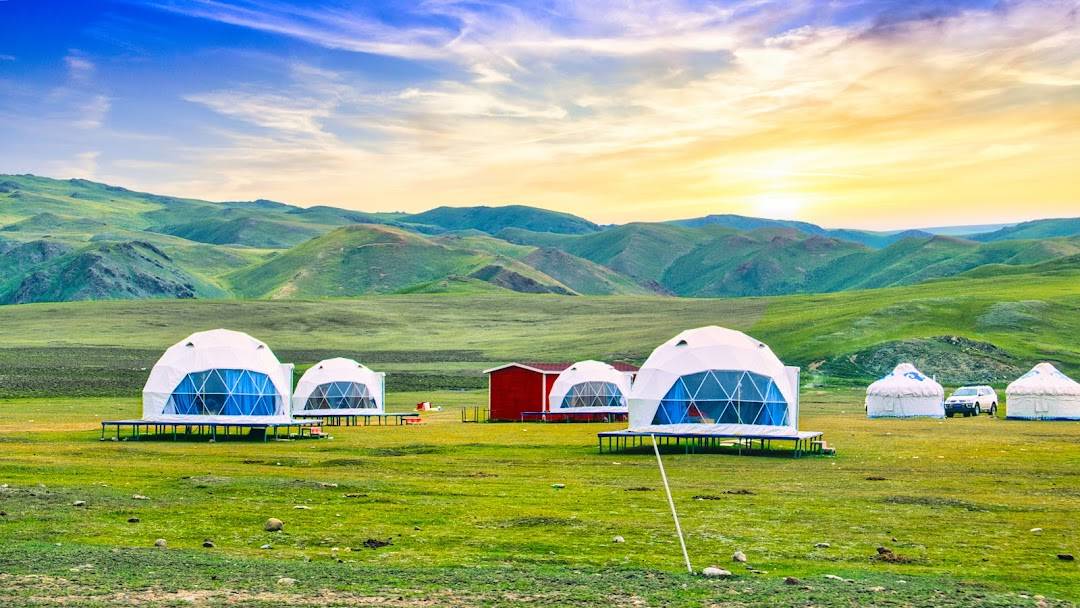 A remote Kazakh village surrounded by pristine grasslands, wooden houses, and streams, offering opportunities for hiking and horseback riding.