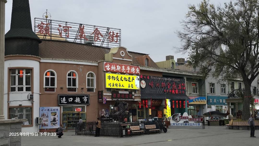 A lively night market in Burqin offering local delicacies such as grilled fish and traditional drinks like kvass.