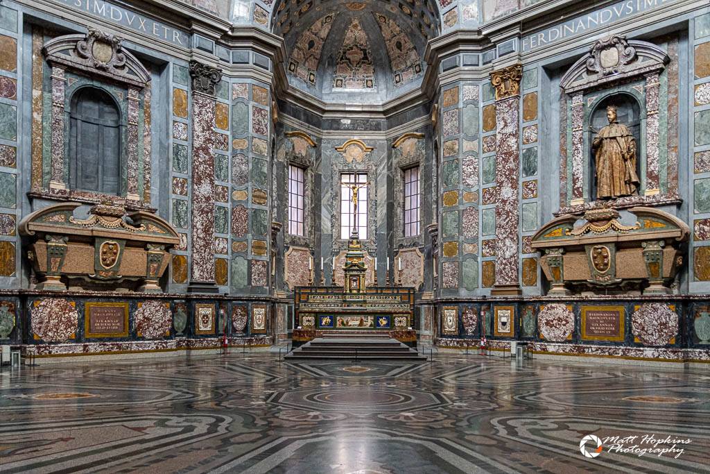 美第奇小堂位於聖洛倫佐教堂後部,是美第奇家族奢華的墓葬空間,其中新聖器室由米開朗基羅設計。內部大理石裝飾和雕塑精美,展現了佛羅倫薩最具權勢家族的榮光。