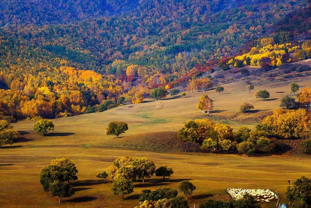 小河頭掩映在層層疊疊樺樹林中,午後的陽光還是給秋日帶來些許暖意,放肆的在厚厚金黃落葉中穿行,耳邊除了潺潺流水聲外,不時聽到昆蟲發出的叫聲。
