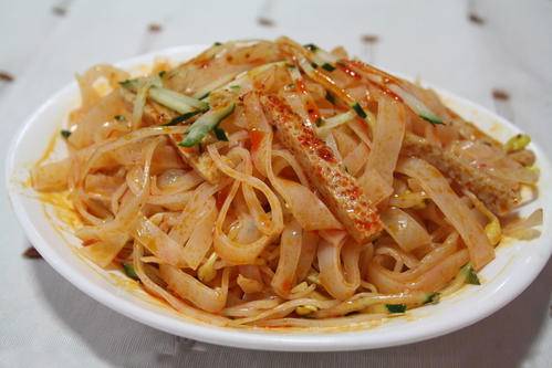 涼皮在陝西有很多種叫法,如果不去刨根問底,大多數是指秦鎮米皮。一直以來,流傳着兩句順口溜:“乾州鍋盔岐山面,秦鎮穰皮繞長安”,“穰”在陝西話裏有柔軟筋道的意思,所以秦鎮米皮在當地又被稱作“穰皮兒”。秦鎮米皮不僅好吃,還具有觀賞性,切涼皮的師傅手握一把威風凜凜的大鍘刀,“咣、咣、咣”幾下便把皮子切成筷子般粗細,引得無數遊客盡折腰。