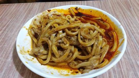 麪皮比秦鎮米皮稍厚,通常切成兩指寬,層層疊在碗裏,軟如紗布。把熱米皮浸入湯汁中,很難像涼拌的秦鎮米皮那樣吸溜食用,但咀嚼起來柔軟綿密,拌上香味綿長的辣油,非得一口吞下三碗,才算過癮。