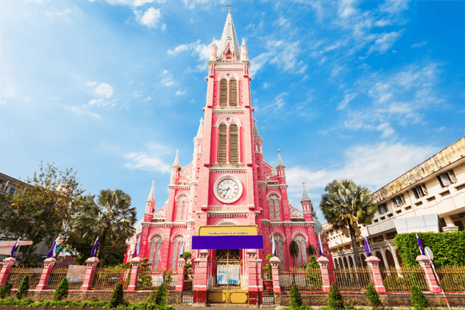 這座建築物是典型的高哥特式建築,擁有兩座塔樓和一座宏偉的鐘樓,加上白色和紅色相間的外牆和尖頂,使其成為峴港市標誌性建築。在主教大教堂內部,可以欣賞到美麗的玫瑰窗、華麗的壁畫和細緻的雕刻。粉紅色的外表吸引着許多“少女心”的遊客前去拍照打卡。
