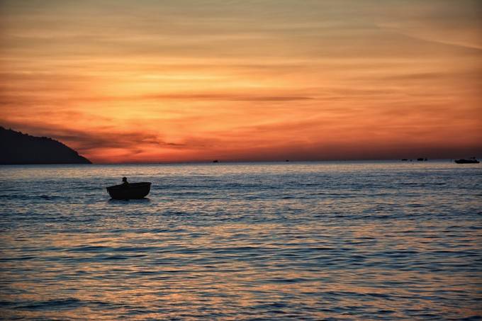 當太陽灑滿了白色的沙灘時,就宛如月光般的晶瑩剔透。遠望海天一色,波濤洶湧中掀起的白色浪花,沙鷗輕飛盤旋,岸邊快樂嬉戲的人們傳來歡聲笑語。偶爾陣陣海風襲來,椰林在水中倒影河渠,搖曳生姿。在傍晚時分,峴港的瑰麗天空換上了夢幻般的紫色,美麗得難以形容。