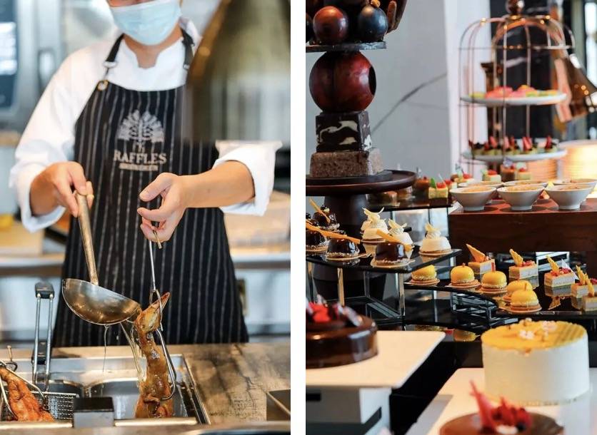 星空坊在萊佛士酒店34樓,餐廳內全幕落地窗,可眺望遠處的灣區景觀,視野相當開闊。自助餐廳分為4大檔口,分別是海鮮刺身檔、東南亞及中式檔、西式鐵板檔和甜品檔。海鮮刺身檔口包含了波士頓龍蝦、帝王蟹、法國生蠔等海鮮,每天不限量供應,在夕陽美景和美味佳餚的襯托下,小酌一下也是不錯的選擇。【推薦單品】自助餐。【人均參考】802-919元/人。