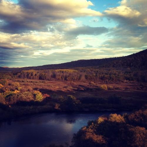 在山頂,可以遠眺根河的蜿蜒流動以及額爾古納市的景象,層層交錯的房屋白天時呈現出藍色和粉色,傍晚則令人陶醉於美麗的日落。